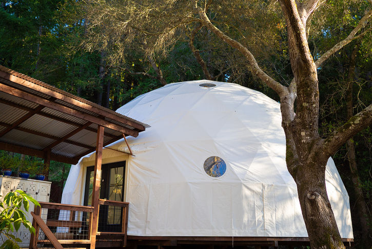 The Lotus Dome is a 36 foot geodesic sanctuary nestled in a quiet redwood grove on our historic estate. Designed as a space for movement, ceremony, creativity, and meaningful gathering, it holds natural light, warm acoustics, and a hand-painted lotus mandala at its center. The Dome offers 1,018 square feet of open floor space that adapts easily to retreats, events, and creative productions. Guests often describe it as a place where clarity arrives, collaboration deepens, and time slows down.